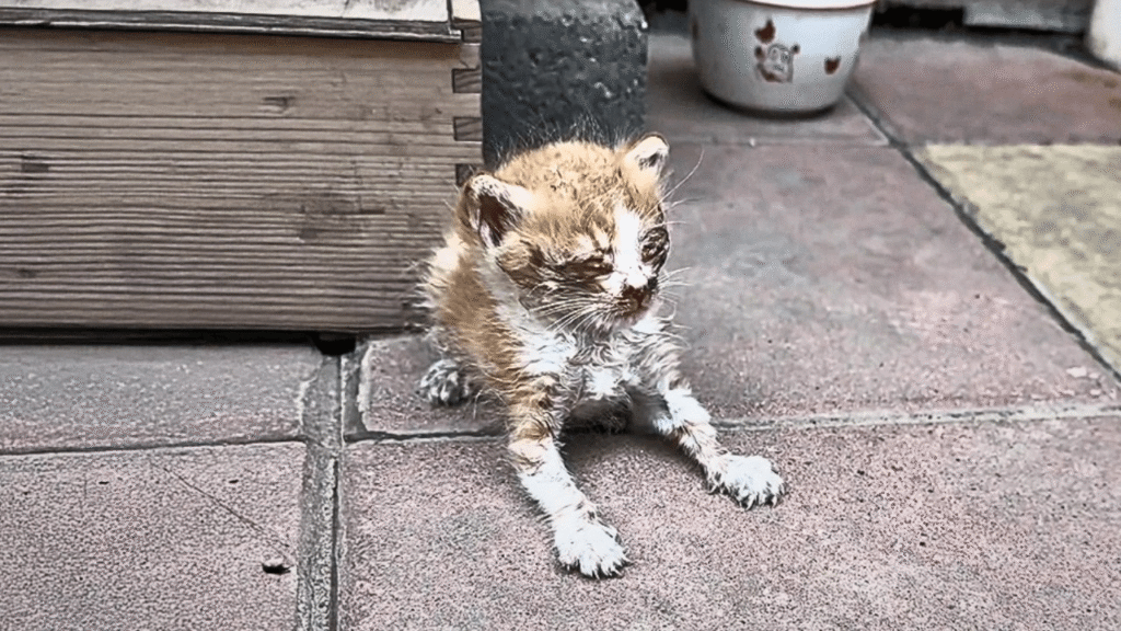 She came from the shadows—silent, frail, and barely clinging to life. A tiny, sick kitten no more than a few weeks old, stumbling blindly down a quiet alleyway. Her eyes were completely crusted shut, sealed by infection. Each step she took was unsteady, her thin legs trembling beneath her, her frail body swaying like a leaf in the wind.