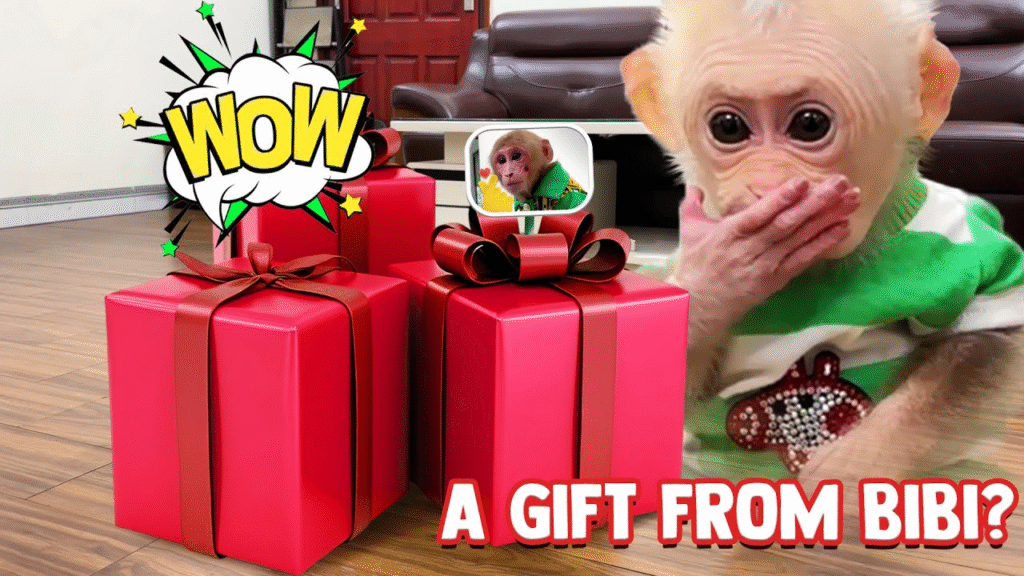 With a cheeky grin and a skip in his step, BiBi walked into the room holding a tiny, colorful box wrapped with a red ribbon. LaLa’s eyes widened as she sat up, curious and confused. “What’s this?” she seemed to ask, tilting her head. BiBi giggled, clearly excited. He placed the box gently in front of her and tapped the lid with his tiny finger, encouraging her to open it.