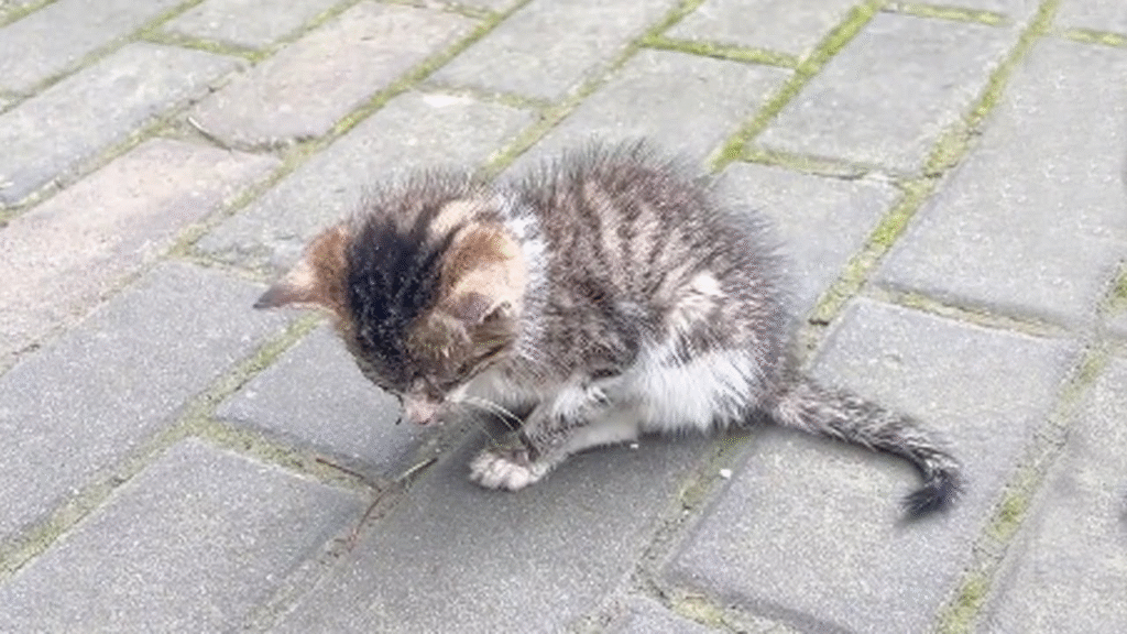 It was a hot, unforgiving afternoon when the tiny kitten was first noticed. Lying motionless on the edge of the sidewalk, her frail body barely moved with each shallow breath. Her fur, once surely soft and clean, was now matted and clumped with dirt and dried blood. Small, painful wounds covered her back and legs—evidence of the cruel world she had been trying to survive in alone.