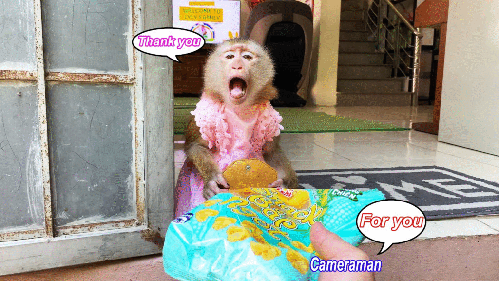 Lyly’s eyes lit up instantly. “For me?” she seemed to ask, her little hands reaching for the box. She opened it slowly, her face a perfect mix of surprise and delight. Inside was a cute monkey purse filled with shiny pretend coins and tiny treats! She let out a squeal of happiness, hugging the gift and jumping in excitement.