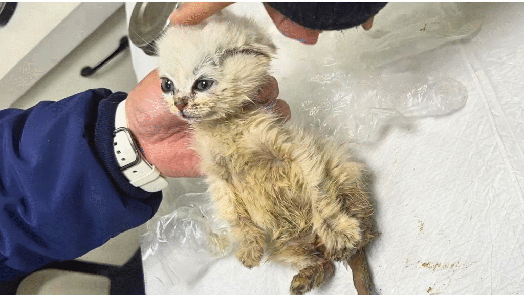 It was a cold, rainy afternoon when the tiny kitten was found—soaked to the bone, trembling, and barely breathing. Curled up beside a trash bin, its fragile body looked more like a soggy rag than a living creature. The raindrops poured down relentlessly, and most people walked by without noticing. But then, one kind soul stopped.