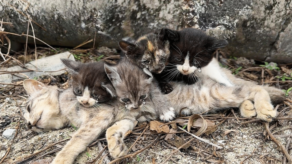 In a quiet, forgotten alley, four tiny kittens huddled close to their mother. She lay still, her breathing shallow, her eyes barely open. The kittens, no more than a few weeks old, whimpered softly, their tiny bodies trembling as they clung to her fragile frame. They didn’t understand what was happening, but they knew something was terribly wrong. Their mother, who had once fiercely protected and fed them, was now too weak to move, too weak to even respond to their cries.