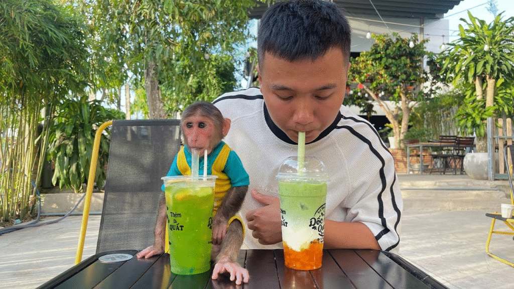 It was a sunny afternoon, and the air was filled with the gentle hum of cicadas. Cubis Monkey was lounging lazily on the porch when Dad called out, “Hey Cubis! Want to go out for a bit?” Cubis’s eyes lit up instantly. He knew exactly what that meant—milk tea time!