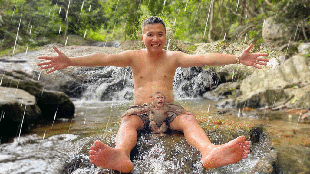 Cubis Monkey LOVES Super Cold Waterfall in Rainy Season!