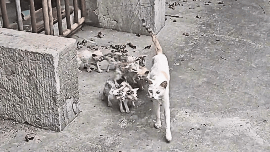 In the shadows of a forgotten alley, a mother cat lay weak and trembling, her ribs visible beneath her matted fur. Around her, six tiny kittens cried out, their mews barely louder than a whisper. They nestled close to her body, trying to find warmth and what little nourishment she could still provide. Days had passed without proper food, and every breath the mother took seemed like it might be her last.