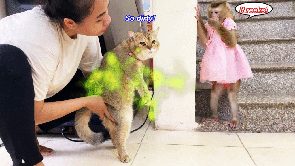 Lesson of the day? Even best friends need boundaries… especially when they smell like trash! 🐒🐱💦