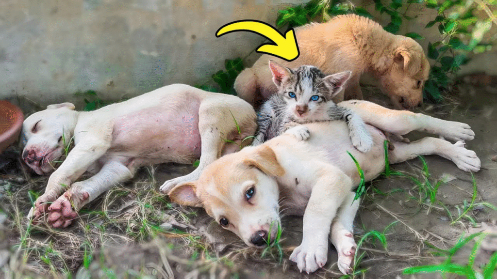 When their owner finally came outside, she froze at the sight—two puppies wrapped around a baby kitten like a real mom and dad. At first, she thought it was just a cute moment. But as the hours passed, the bond only grew stronger.