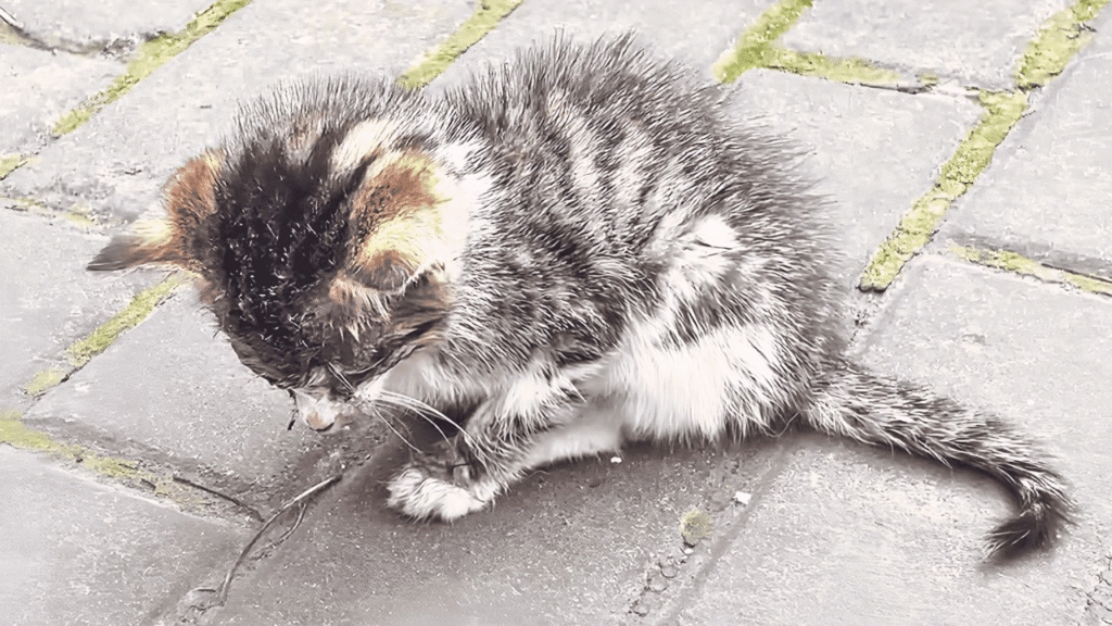 In a quiet alley tucked between crumbling walls and overflowing trash bins, a tiny stray kitten sat with its head down, barely breathing. Its fur was matted, its ribs visible through its thin body, and its eyes were crusted shut from infection. The little one didn’t meow, didn’t move—only shivered silently as the world passed it by. It had stopped hoping for food or warmth. It simply waited… for the end.