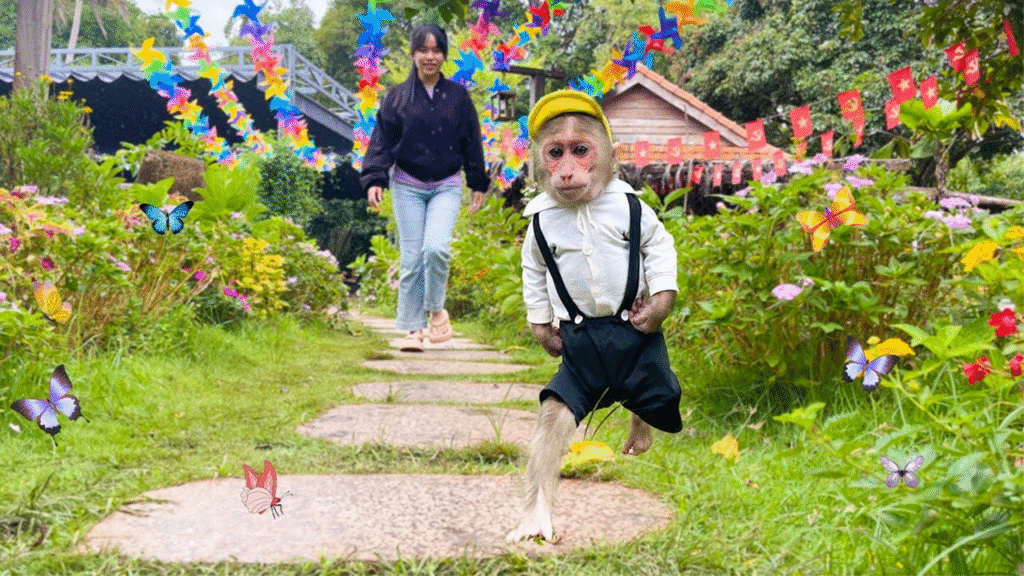 It was a bright and breezy morning when little Cubis, the ever-curious monkey, embarked on his latest adventure. Today, he was headed somewhere brand new—a peaceful riverbank with a cozy, one-of-a-kind café nestled beside it. His wide eyes sparkled with excitement as he clung to his aunt’s shoulder, tail swaying in rhythm with the breeze.