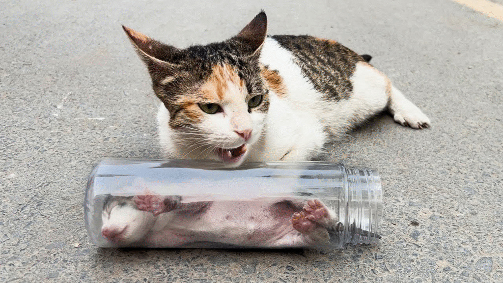 Looking closer, the shocking truth was revealed: one of her tiny kittens had somehow crawled headfirst into the narrow neck of the plastic bottle and was completely stuck inside. The poor thing was barely moving, wedged tightly with just its tiny legs visible. The mother cat cried out over and over, trying everything she could to help her trapped baby.