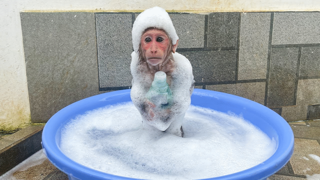 As soon as Dad turned his back, Cubis tiptoed—well, as much as a monkey can—toward the bathroom. He pushed the door closed behind him with a quiet click and climbed right into the basin. With a mischievous grin, he dipped his tiny hands into the soapy water and started splashing. Within minutes, bubbles floated everywhere. Cubis rubbed the soap onto his arms, chest, and even his face, giggling at the frothy mess he was creating.