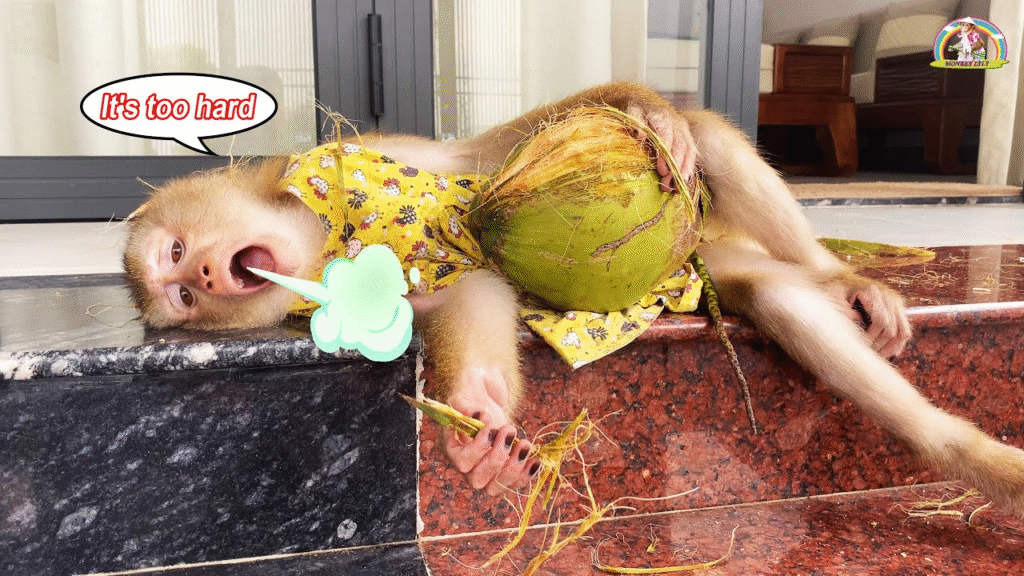 Not ready to give up, Lyly carried the coconut over to a rock. She lifted it high above her head with all her strength and dropped it. Thud! It bounced right back, nearly startling her off her feet. Her expression—wide eyes and puffed cheeks—made her human family burst into laughter. But Lyly wasn’t finished. She dragged the coconut over to the steps, pushed it down like a ball, and chased after it with playful squeaks, as if she had turned her snack into a game.