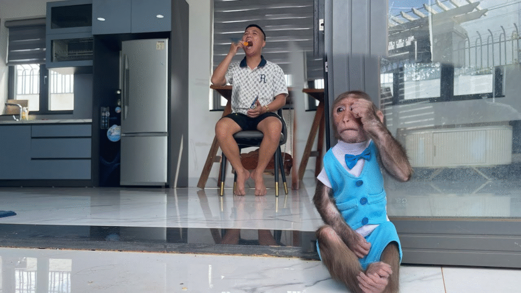 Dad couldn’t help but laugh at the sight of Cubis pouting like a child. The little monkey peeked over his shoulder a few times, making sure Dad noticed his sulk, but he refused to break character. Finally, Dad relented, placing the treat in Cubis’s hands. In an instant, the anger melted away. Cubis squealed with delight, gobbled down his snack, and leapt back into Dad’s arms, smothering him with affection as if nothing had happened.