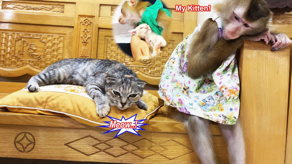 Monkey Lyly had grown quite attached to the tiny kittens that had been staying in her home. From the very first day they arrived, fragile and meowing for comfort, she had watched over them with curious eyes. She often sat nearby as they were fed, sometimes reaching out gently as if to check that they were safe. In her own playful way, Lyly had become part of their little family.