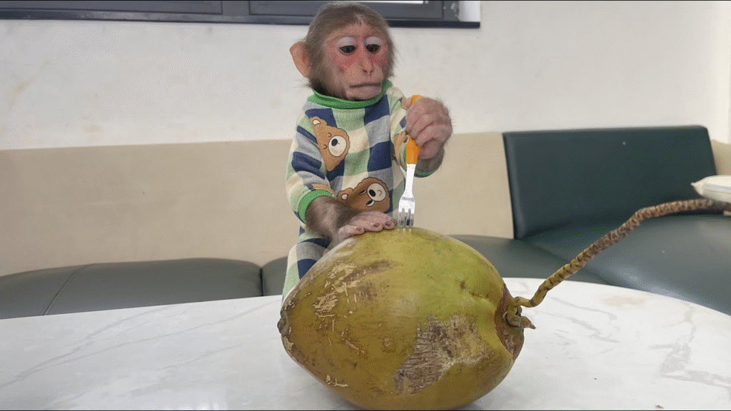 Without hesitation, Cubis reached for the coconut. Instead of waiting for help, he proudly grabbed the closest utensil he could find—a plain old fork! Dad froze, half laughing, half panicking, as Cubis jabbed at the tough shell with determination. Every poke made a funny thunk sound, and Cubis giggled as if he were making music. Dad shook his head, completely helpless, wondering how on earth his little one thought a fork could do the job.