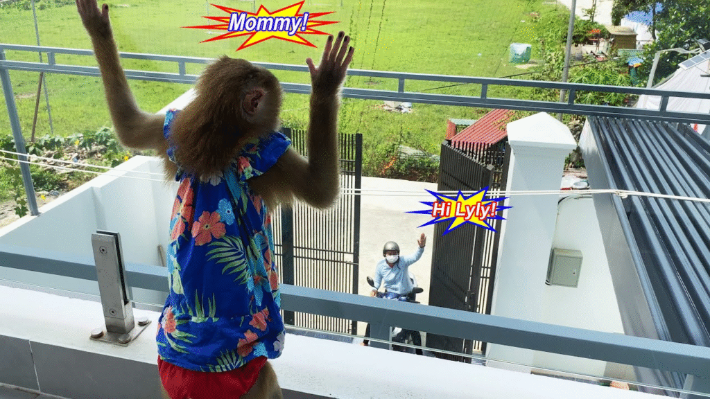 To pass the time, she climbed up and down the porch railing, swinging and chattering as if practicing how she’d celebrate when Mom returned. Now and then, she peeked into the empty baskets, imagining them filled with sweet bananas, juicy fruits, or maybe even her favorite roasted peanuts. Her face lit up at the thought, her little mouth smacking as if she could already taste them.