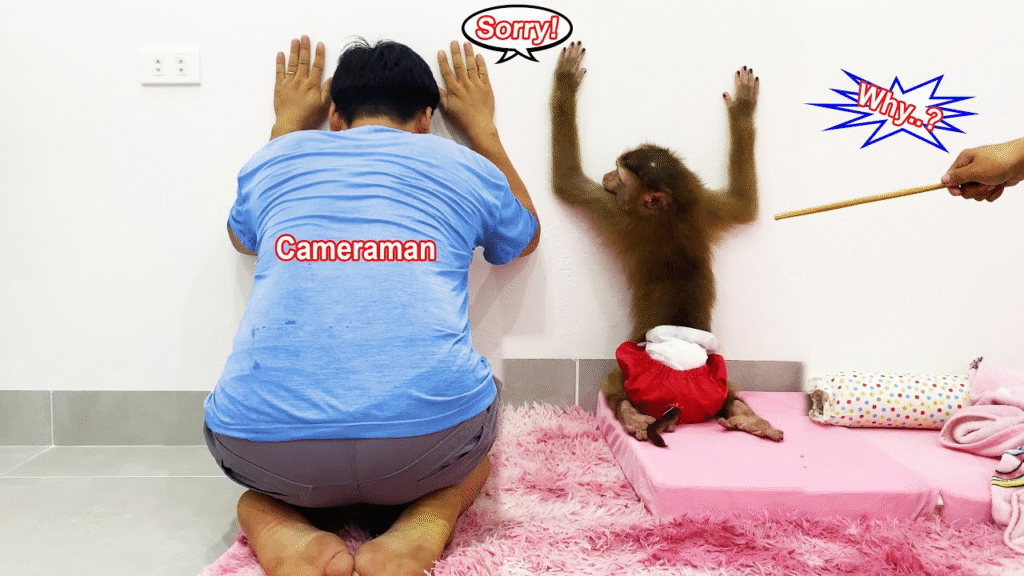 Monkey Lyly had always been a curious little one, full of energy and endless mischief. On this particular day, instead of playing with her toys or following her mother around, she found a new companion—the cameraman who often came to film her daily adventures. His shiny camera, dangling straps, and patient presence fascinated Lyly.