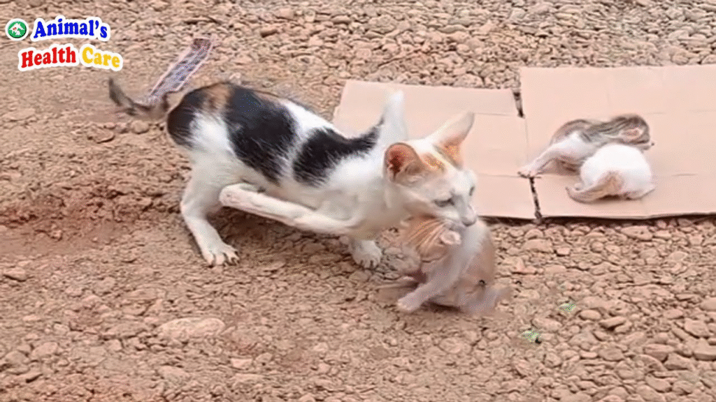 It was heartbreaking to watch. She had no safe nest, no food, and no shelter. Every ounce of strength she had was poured into carrying her kittens to where she hoped compassion lived. And when one family finally bent down to look closely, they realized her painful truth: she wasn’t just asking for food—she was asking for rescue.