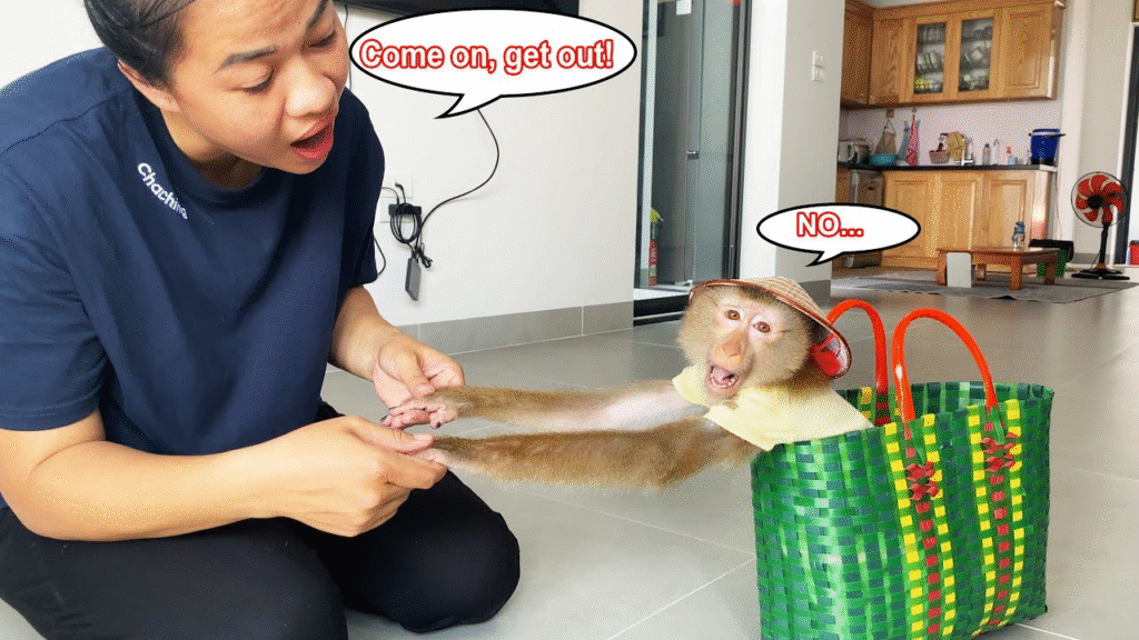 It was a sunny afternoon when I decided to head to the market with Lyly, my mischievous little monkey. She usually perched on my shoulder or clung to my arm, but that day she had a very different idea. As soon as I placed the big woven shopping basket on the floor to get ready, Lyly’s eyes lit up with excitement.