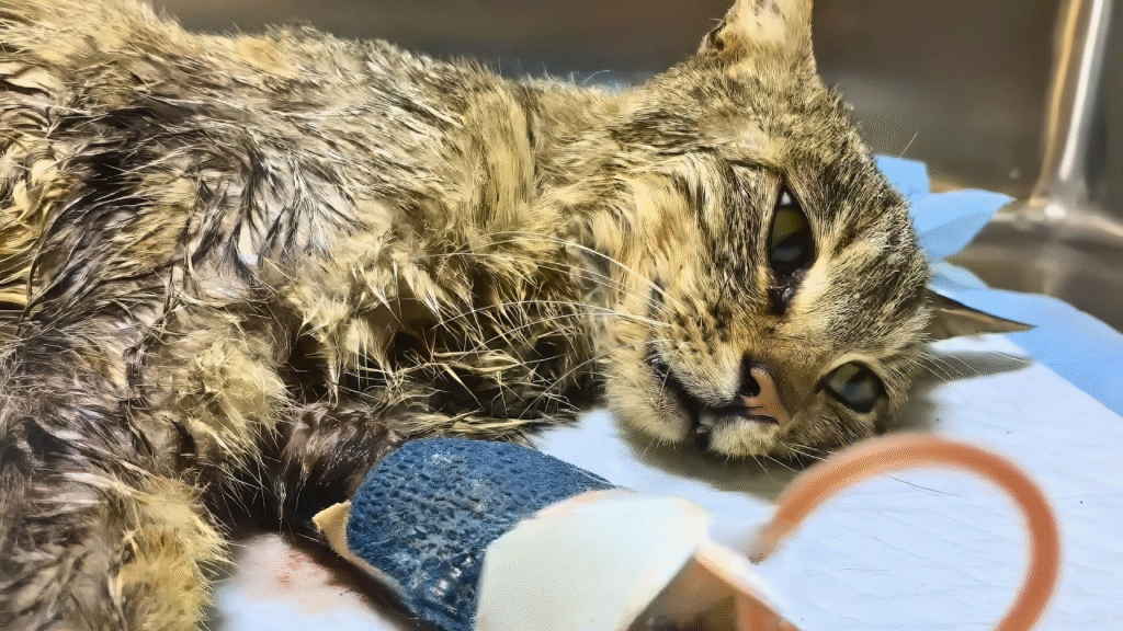 On the edge of a deserted alley, a frail stray cat lay curled beneath a broken wooden crate. Her ribs pressed sharply against her skin, every breath a struggle, yet inside her fragile body, life still stirred. She had carried her kittens with a mother’s quiet hope, believing that maybe—just maybe—they would have a chance at a kinder life than hers.