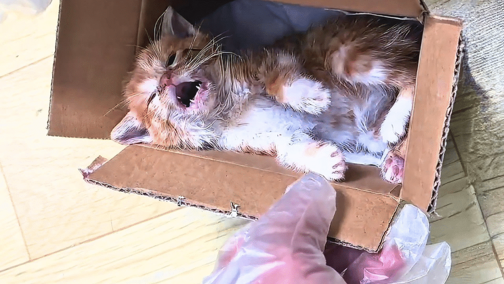 On a bitterly cold morning, the streets were silent except for the faint cries of tiny voices struggling to be heard. Huddled together under a torn cardboard box, a litter of newborn kittens trembled, their fragile bodies no match for the cruel chill of winter. Their mother was nowhere in sight—perhaps gone in search of food, perhaps lost forever. With no warmth, no milk, and no protection, the little ones lay there helplessly, their mews growing weaker as time passed.