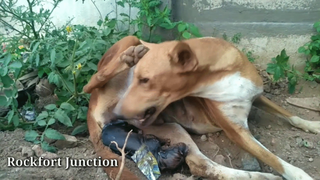 On a quiet corner near the old stone walls of Rockfort, a street dog lay hidden beneath a bush. Her belly was swollen with life, and tonight was the night her journey as a mother would begin. The air was heavy with tension as she circled the spot, scraping the dirt to make a small nest. Alone and vulnerable, she let out soft whimpers, calling silently for strength.