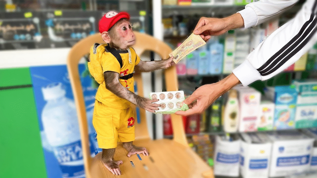 Carrying a small pouch, Cubis trotted down the street toward the pharmacy. People along the way chuckled at the sight of a little monkey walking so seriously, clutching his bag as if it were treasure. At the pharmacy, he carefully handed the note and money to the shopkeeper. Everyone in the shop gasped softly at how clever and responsible he was. The pharmacist smiled warmly, gave Cubis the medicine, and even patted his head.