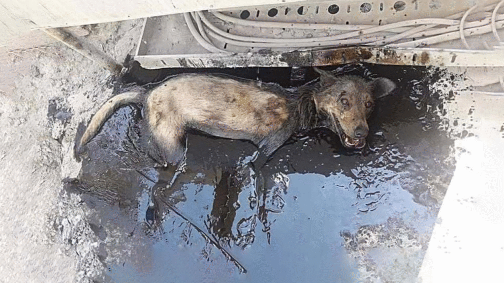 On the edge of a construction site, a stray mother dog wandered in search of food. Her ribs showed through her thin fur, but her heart was strong—she had several tiny pups hidden nearby, waiting for her to return with something to eat. Guided by desperation, she sniffed around the site, unaware of the danger ahead. In a cruel twist of fate, she stepped onto a pool of sticky tar.
