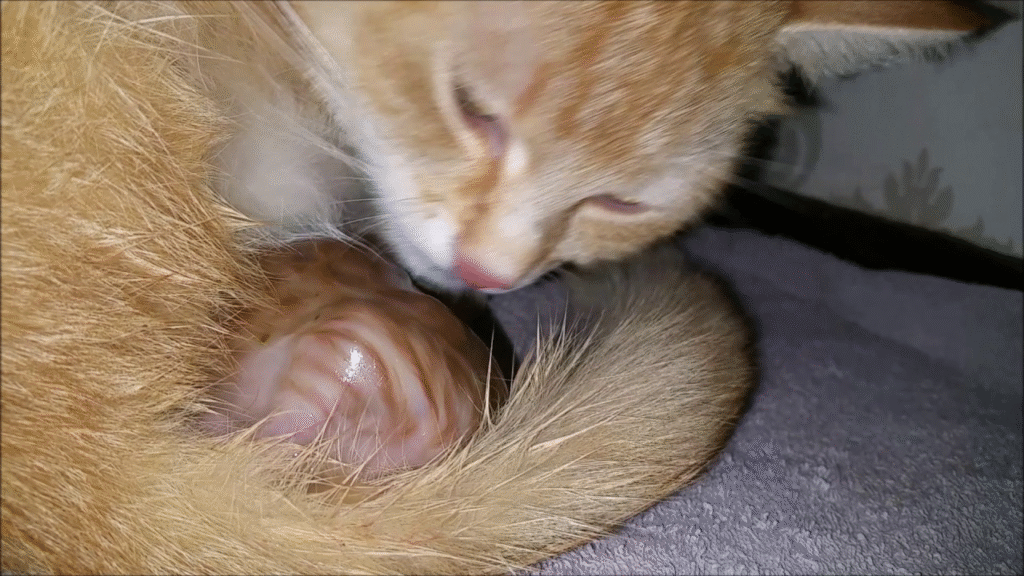 With gentle cries and soft contractions, the first tiny life entered the world. A small red kitten, wet and trembling, let out its first squeak. The mother cat instinctively cleaned her baby, licking away the birth fluids and warming it with her tongue. Almost immediately, the kitten wriggled closer, searching for milk, guided by pure instinct.