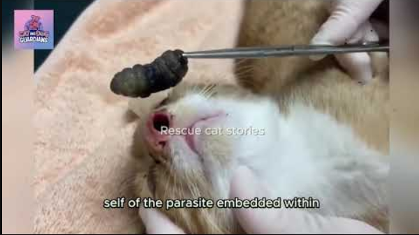 The rescuers quickly took the cat, later named Mimi, to the clinic. She meowed weakly as the veterinarian examined the wound. The larva had made a breathing hole through her skin, and every few seconds, it wriggled, causing Mimi to flinch in pain. The vet carefully explained that the removal must be done gently — squeezing too hard could burst the larva and cause a serious infection.