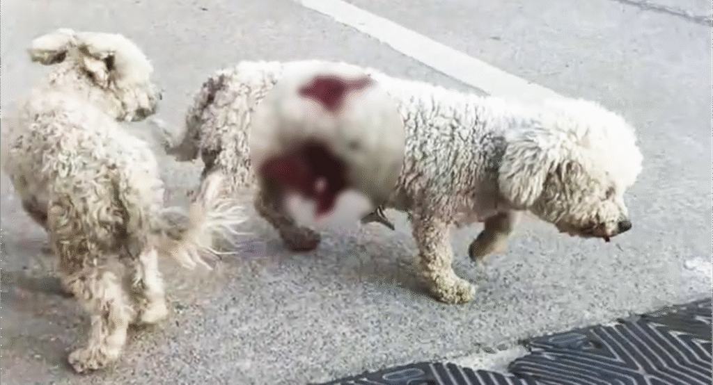 On a cold, gray morning by the side of a busy road, two stray dogs huddled together. One of them, a brown dog later named Max, lay motionless on the ground, his body covered in dirt and wounds. Beside him sat his loyal companion, a smaller white dog named Bella. She refused to move, guarding him with trembling legs and sad, pleading eyes.