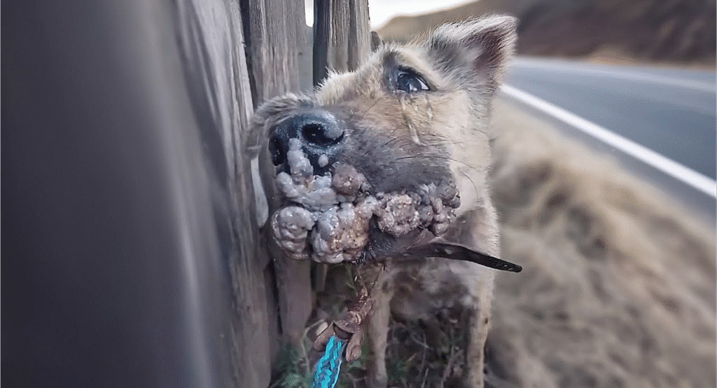When rescuers first saw the poor dog, their hearts shattered. Her face was swollen and deformed by a massive tumor that distorted her mouth. People who passed by often turned away or even laughed, not realizing the pain she endured. Yet despite her suffering, her tail never stopped wagging. She greeted everyone with hope in her eyes — as if she still believed that someone, somewhere, would love her.