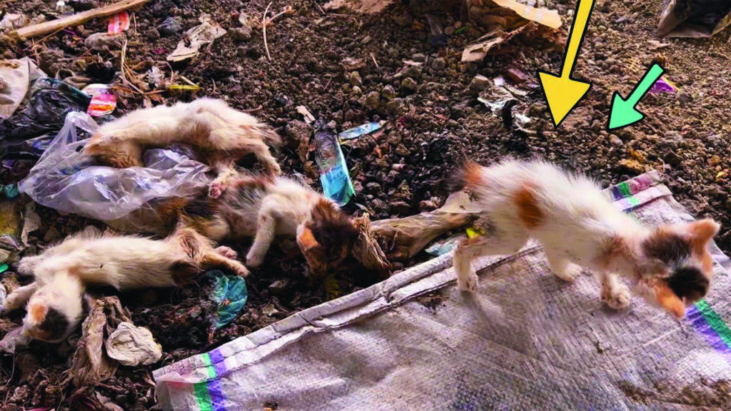 The road was quiet, yet the scene beside it told a story of tragedy. A small group of kittens had been struck by passing vehicles, their tiny bodies lying still. It was clear they had suffered, and anyone who cared for animals would feel their heart shatter instantly. But among the heartbreak, there was a single fragile life still clinging to hope.