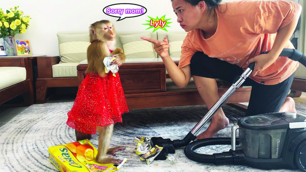 Monkey Lyly was usually a playful and curious little girl, always jumping around the house, discovering new adventures in every corner. But this time… her curiosity had led to trouble. While enjoying a juicy mango she had secretly taken from the kitchen, Lyly slipped and dropped the sticky fruit right onto the clean, bright carpet. Mango pieces squished beneath her feet and sticky juice splattered everywhere. Her eyes widened—uh oh.