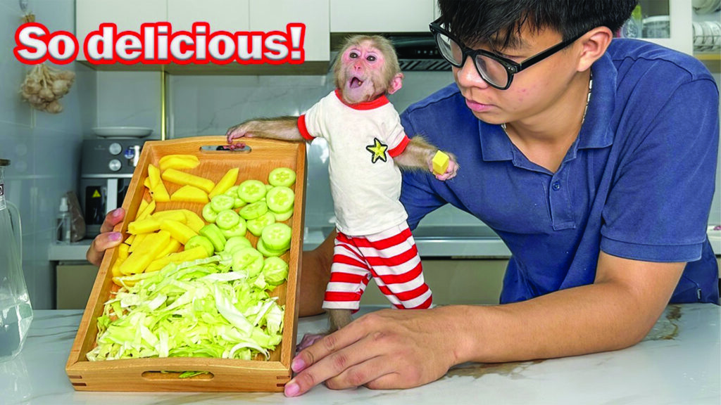 The sun was setting softly outside the kitchen window when Dad called out, “Lala, dinner time!” Lala, the curious little monkey, hurried in with a bright smile and happy footsteps. She loved dinner, especially when Dad cooked something special just for the two of them.
