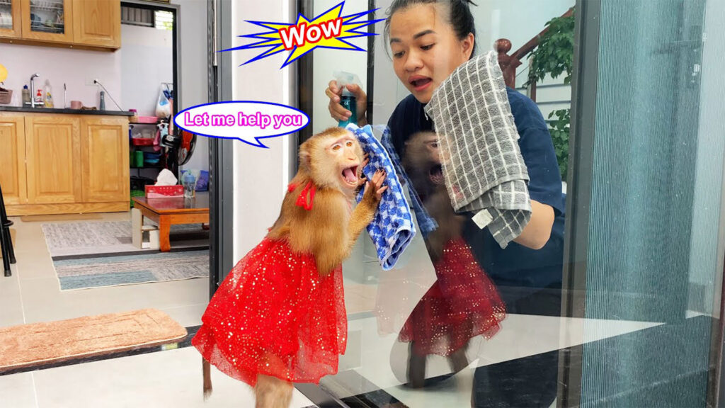 The morning sun shone brightly through the windows, filling the room with golden light. It was cleaning day at home, and Lyly’s mother had just picked up a soft cloth and a spray bottle to start wiping the glass windows. But before she could begin, a tiny figure came running in—Monkey Lyly! Her curious eyes sparkled as she watched her mother work.