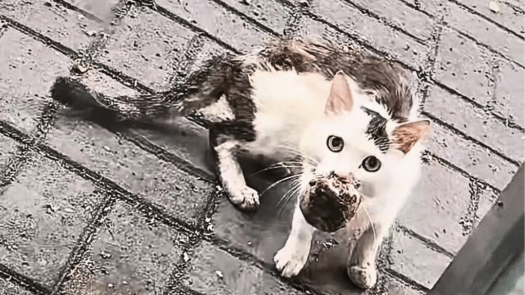 He was just a shadow of a cat when rescuers found him—skin and bones, trembling under a broken fence. His face was swollen with a massive tumor that distorted his mouth and made every breath a painful effort. The poor stray could barely open his jaws to eat. Each attempt to chew ended in agony, yet his dull eyes still held a faint spark, a silent plea for help.